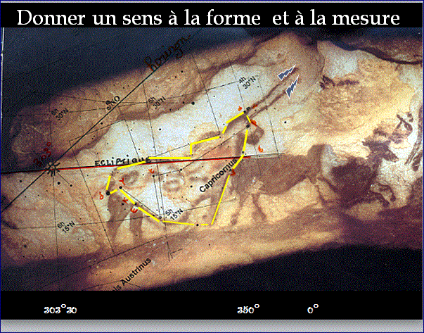 ---Pour Lascaux, la reconstitution du ciel de l’époque en construisant une carte du ciel de 15 600 avant J.-C., permet de repérer que le Soleil couchant solsticial d’été était à la fin du Solutréen et au tout début de l’époque magdalénienne dans la constellation du Verseau, à la limite de celle du Capricorne. On peut donc se dire que la constellation du Verseau était invisible puisqu’éteinte en quelque sorte par la lumière du soleil.